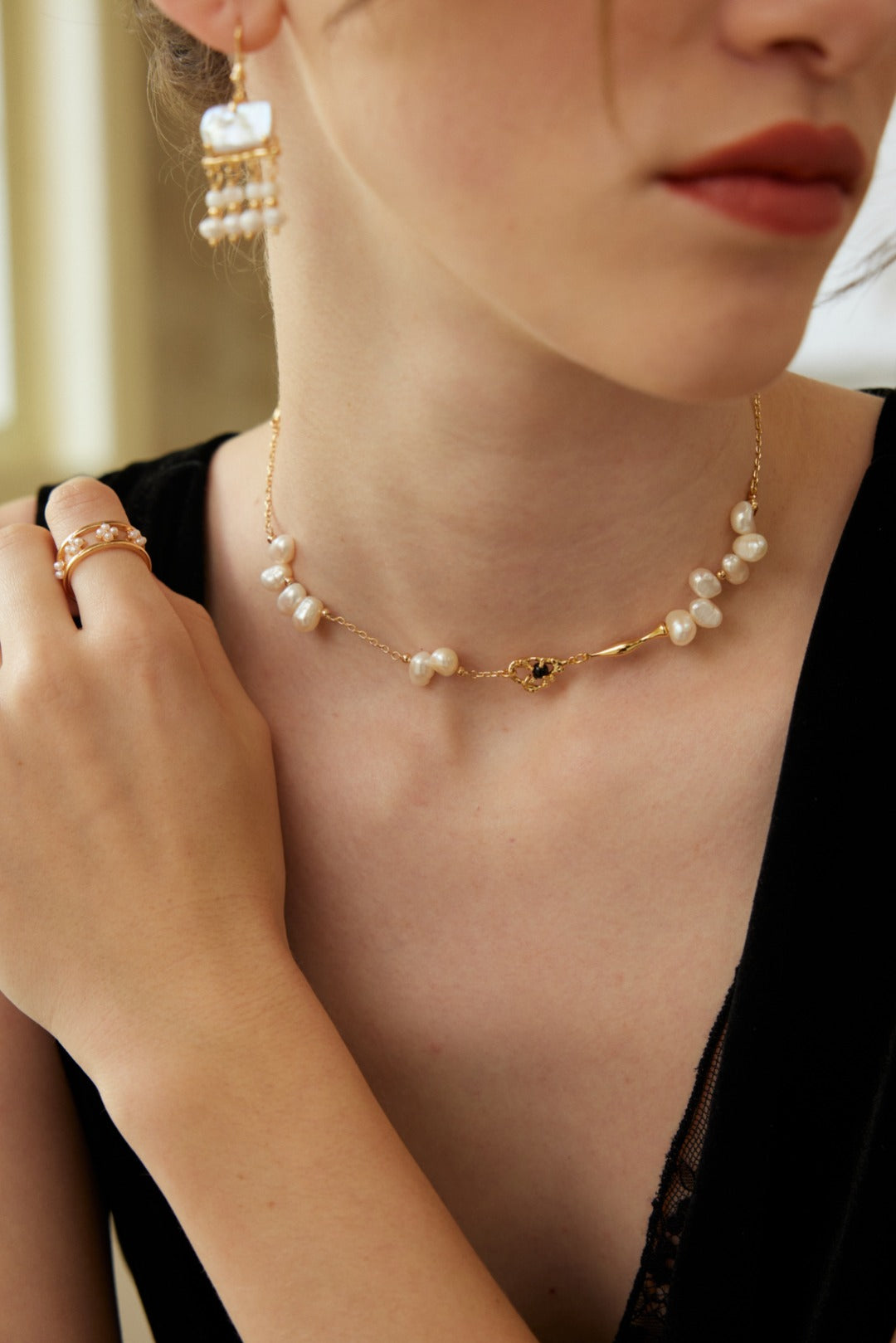 Astraluxe strings 4-5mm shaped pearls and mother-of-pearls into a 4cm poetic tassel - pearls are the scales left behind by mermaids, and mother-of-pearls seal the morning light on the sea level. The vintage gold chain is like a wave crest dyed by the sunset. As you sway with your steps, the pearls and mother-of-pearls collide to make a rustling sound similar to the tide. This is a love letter from the ocean to the land.